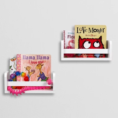 Create a designated bookshelf area for your little ones to keep their favorite books with these wall mounted bookshelves. At just 10ā wide and 4ā tall, these small floating wall shelves are perfect for organizing baby and toddler books in the nursery, displaying nursery dĆ©cor, setting mail in the entryway, or creating an adorable kids bookshelf wall in the playroom. Looking for a small office wall shelf? Pair this white wall bookshelf with one or two more shelves in a staggered or stacked arrangement to set stationery, display small picture frames and other decorative items in your workspace. Not only is this kids wall shelf great for playrooms, entryways and offices, but it makes an ideal small bathroom wall shelf and the perfect solution for adding shelf space and dĆ©cor to small bathrooms. Display small candles, succulents, reed diffusers and more without worrying that anything will fall off the edge, thanks to the horizontal book bar in the front. Includes instructions for easy assembly.
