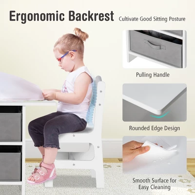 - Kid-friendly Design: The activity desk set has smooth edges and rounded-off corners to keep your children from scratching and bumping. The chairs are built at an ergonomic height for kids to sit in right positions. What’s more, the backrests are slightly tilted to better fit kid’s body and provide a comfortable sitting experience.