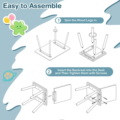 - Ergonomic & Stacking Chairs: To cultivate good sitting posture,these wooden chairs are ergonomically designed with backrests,effectively preventing hunchback. If you want this kids furniture to set save your space when not in use,there are 3 ways for you: 1) store 4 chairs under the table,2) stack 4 chairs on the tabletop,3) stack the chairs in twos.